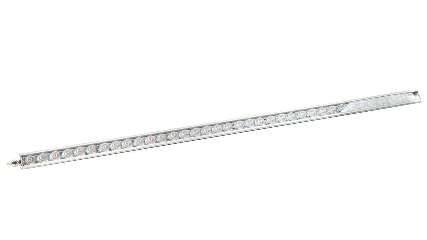 Тонкий линейный светильник для архитектурной подсветки со вторичной оптикой. Светодиоды и линзы защищены от попадания влаги силиконовым прозрачным компаундом (светильник полностью залит).